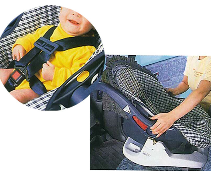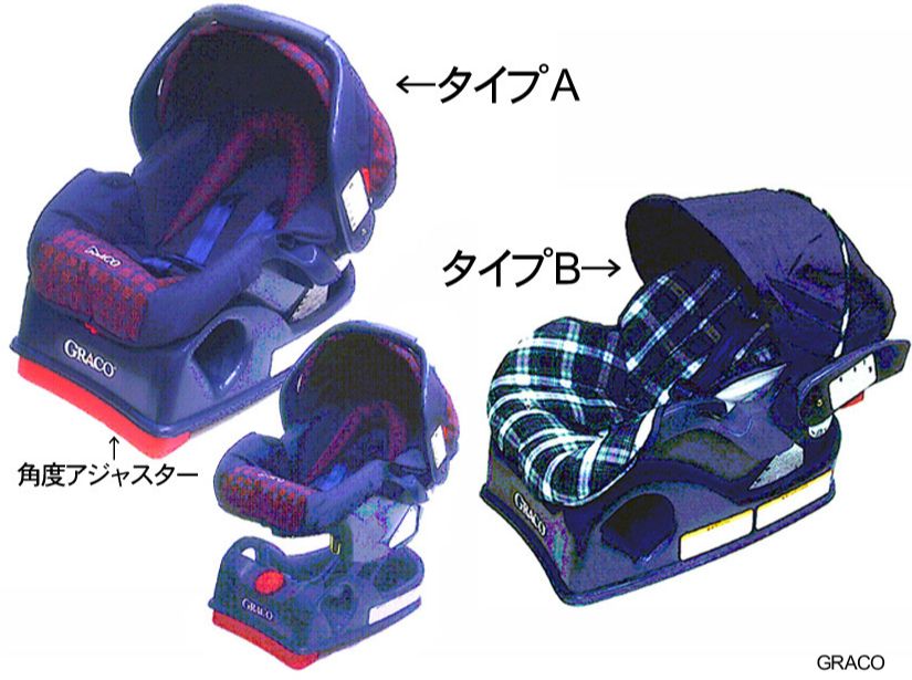後ろ向き着座で、背もたれ約45度にて後部座席に取付けします。 台座をシートベルトで固定しておけば、 キャリー部は簡単に取り外して赤ちゃんを乗せたまま移動できます。タイプAは角度アジャスターとヘッドレスト付。タイプBは角度アジャスターとヘッドレストを省略したものです。