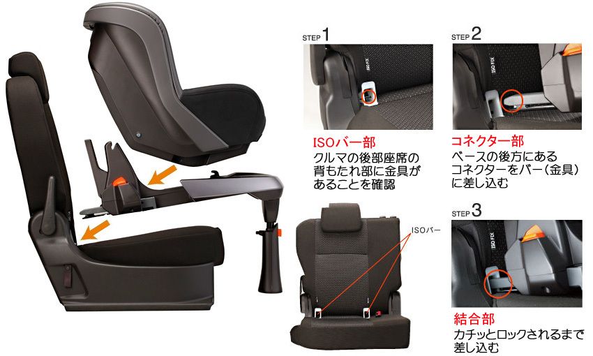 クルマに装備されたISOFIXアンカー(取り付け金具)に、ベースシートについているコネクターを接続して固定します。