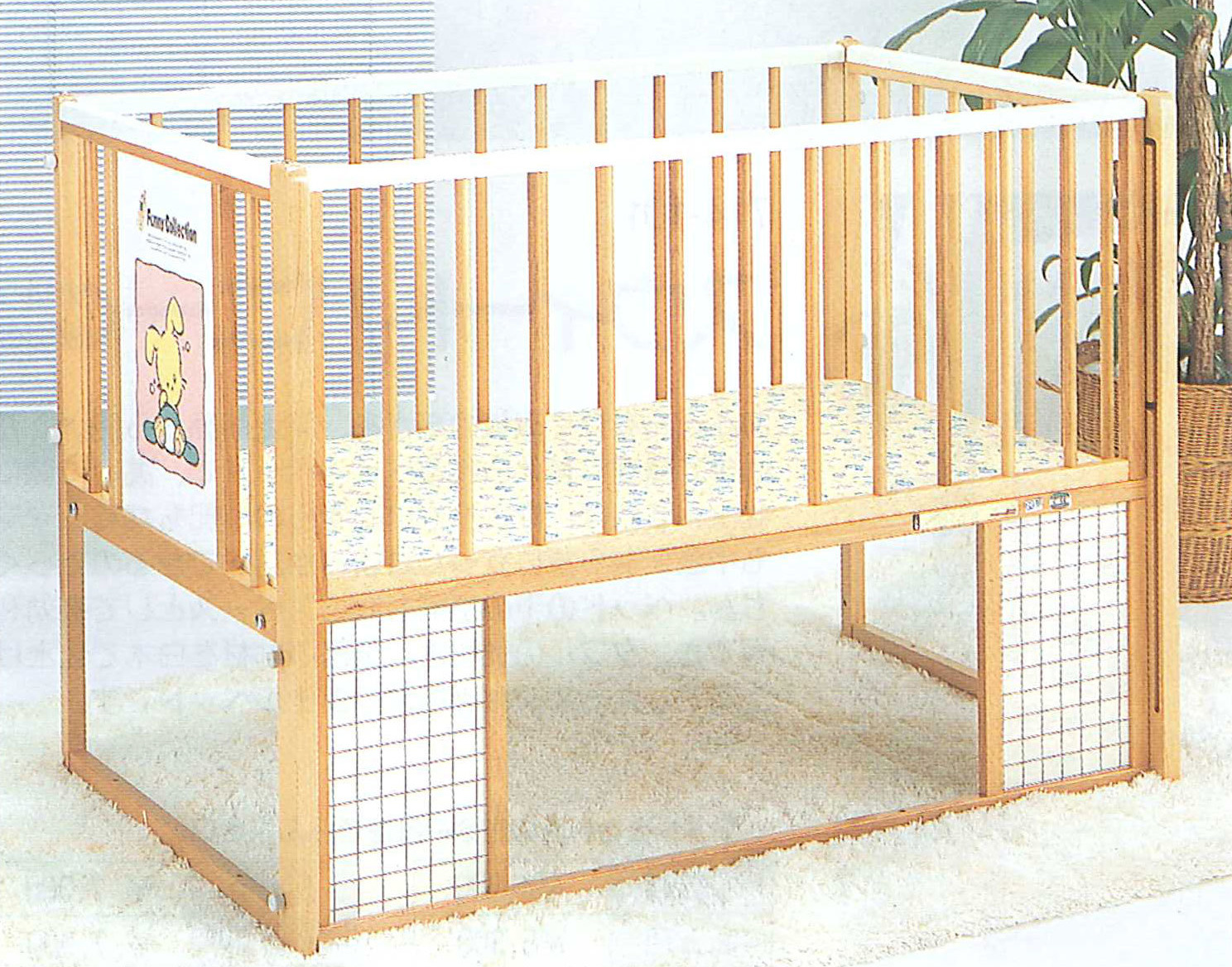 ベッド下部の柵を取り除き、 収納スペースとして有効に使えるよう工夫しました。 上部の柵の深さは約50センチ。生後1年以内であれば安心して使える深さです。