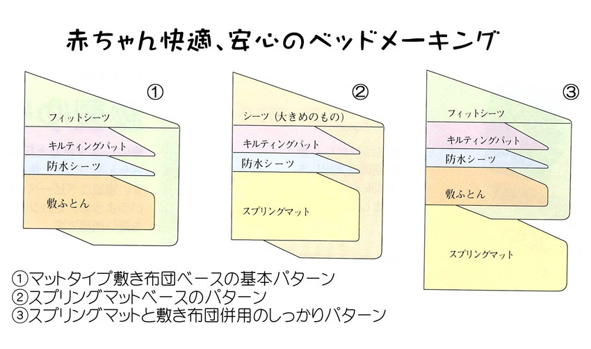 お子さんの動きでパットやタオルが撚れてしまうのを防ぐには、全体をフィットシーツでくるむと理想的です。上記の図(1)のメイキングです。